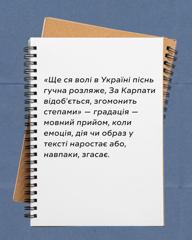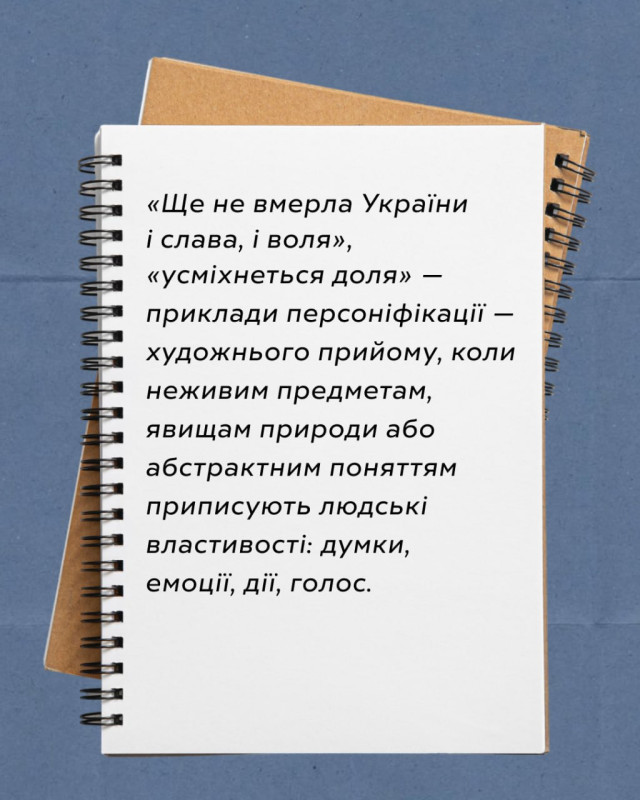 У візуальному проєкті пояснено, які саме засоби вживаються у гімні: персоніфікація, метафора, алюзія, гіпербола та інші.