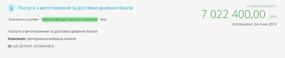 Процедуру відкритих торгів із закупівлі спеціальних картонних коробок в кількості 137 076 штук (з урахуванням проведення 2 туру виборів) тендерний комітет Комісії оголосив ще 24 січня через систему ProZorro. Витратити на закупівлю боксів в ЦВК планували понад 7 мільйонів гривень. Таким чином, кожен бокс обходився б в 51 гривню.Відповідно до тендерної документації, по 2 бокси повинні були відправитися на кожну маленьку і середню виборчу дільницю, по три на кожну велику, по 10 – на кожну ОВК і для самої ЦВК – 1000 штук.