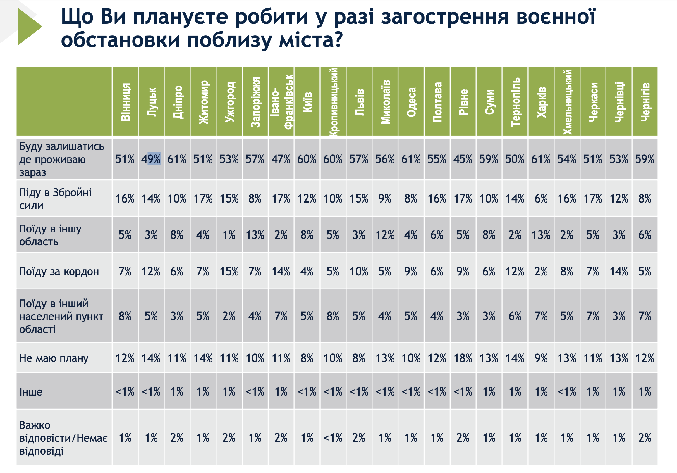 На запитання «Що ви плануєте робити в разі загострення воєнної обстановки поблизу міста?» 49% мешканців Луцька відповіли, що залишаться там, де проживають зараз. 14% опитаних підуть у Збройні сили. 3% респондентів будуть виїжджати в іншу область, 12% – за кордон, а 5% – в інший населений пункт Волинської області. 14% опитаних не мають планів на випадок погіршення ситуації.Водночас 89% лучан оцінюють майбутнє України як «скоріше обнадійливе».
