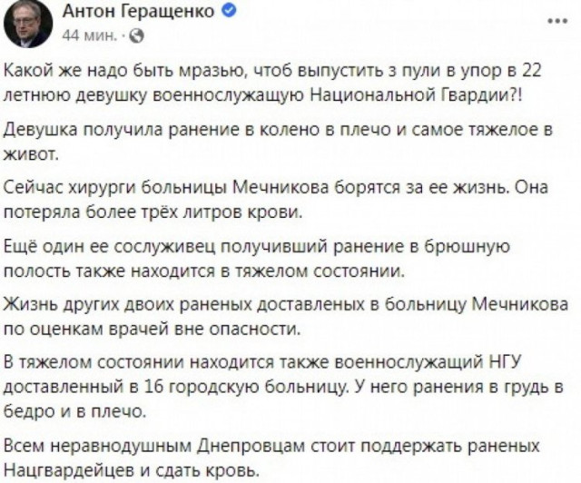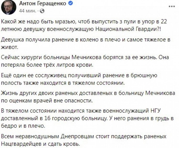 Як пише у Facebook радник міністра внутрішніх справ України Антон Геращенко, найважчі травми отримала 22-річна дівчина, передає Depo.Дніпро.