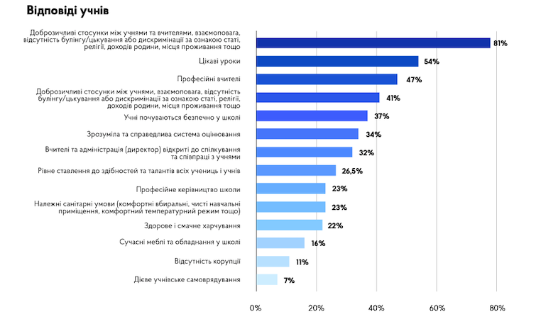 Батьки вчителі та очільники шкіл також наголошують на важливості безпечного середовища – відсутності булінгу або дискримінації за ознакою статі, релігії, доходів родини, місця проживання тощо.Школярі визначили власні критерії, які важливі їм для якісного навчання у школі: