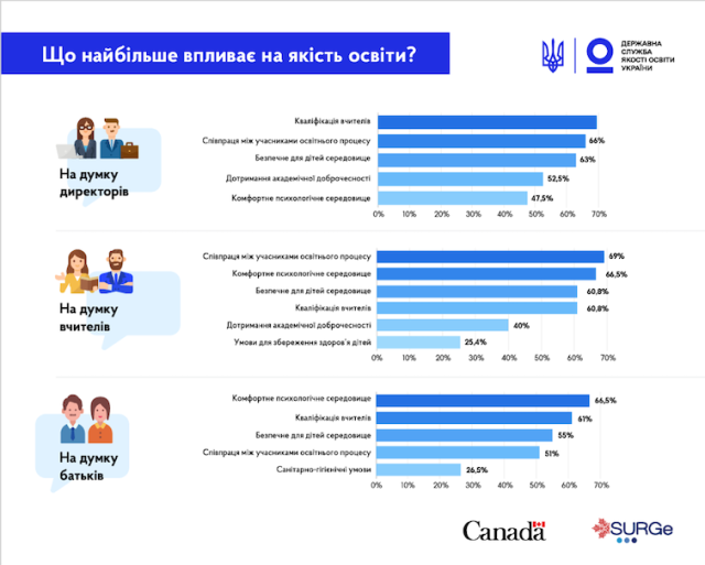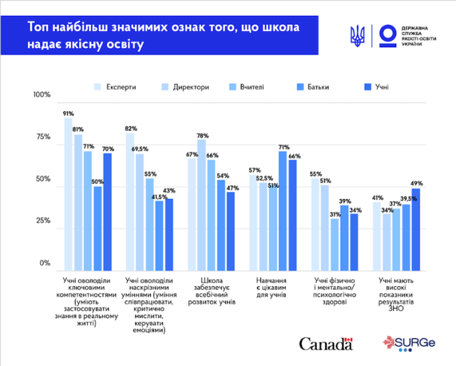 37% – за безпеку у школі.Загалом 81% директорів, 71% вчителів, 70% учнів та 50% батьків вважають, що вміння дітей застосувати свої знання в реальному житті свідчить про те, що школа надає якісну освіту.