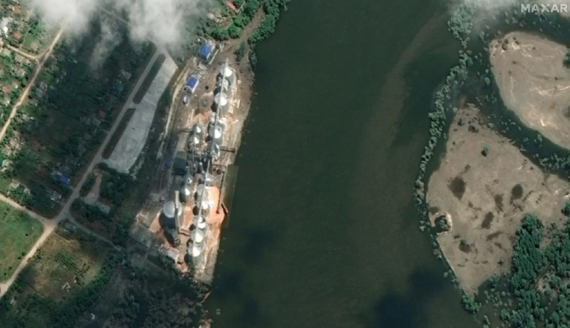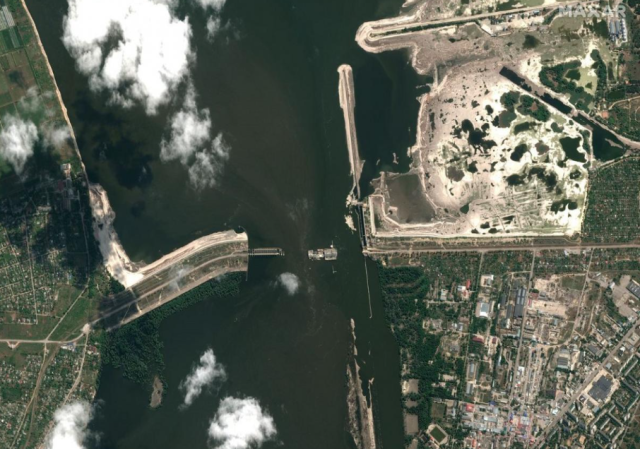 З’явилися свіжі супутникові знімки наслідків підриву греблі Каховської ГЕС російськими військами.