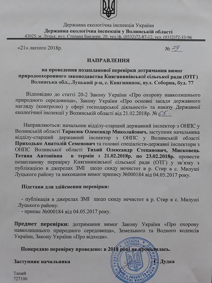Як згодом повідомила Олена Твердохліб, Держекоінспекція направила людей для перевірки труби, проте чомусь у сам Княгининок.У державній екологічній інспекції повідомили, що на місце виїжджали, однак зливу нечистот не зафіксували, пише Волинь24.