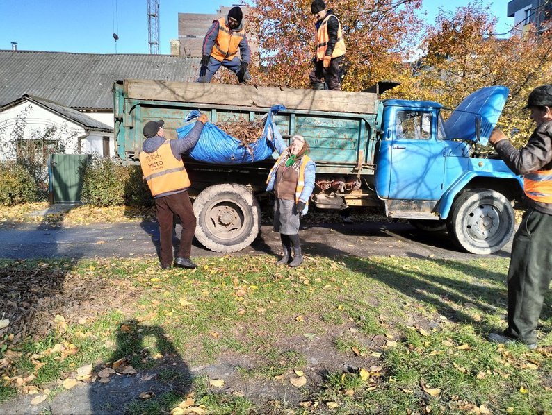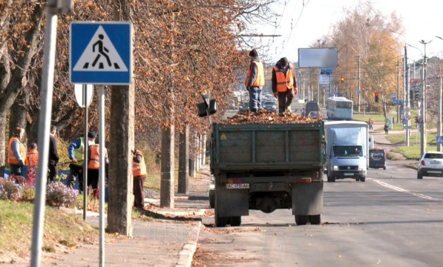 На вулиці Рівненській працівники приватного підприємства згрібають опале листя, а згодом вантажать на трактор чи машину.