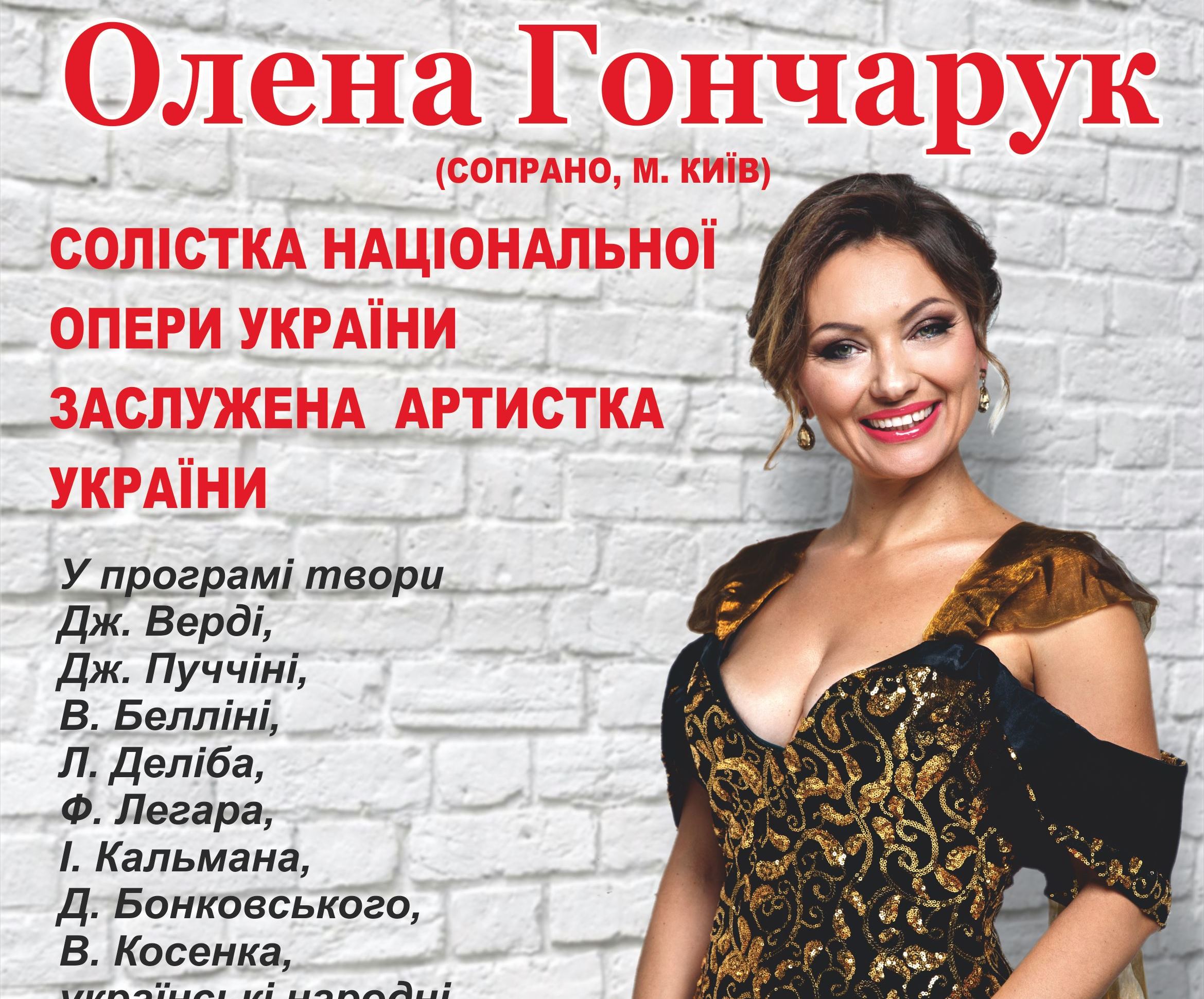 12 квітня в Палаці культури міста Луцька знову очікується цікава зустріч – цього разу з солісткою Національної опери України, лауреаткою міжнародних конкурсів та фестивалів, заслуженою артисткою України, володаркою титулу «Жінка року» Оленою Гончарук (сопрано).