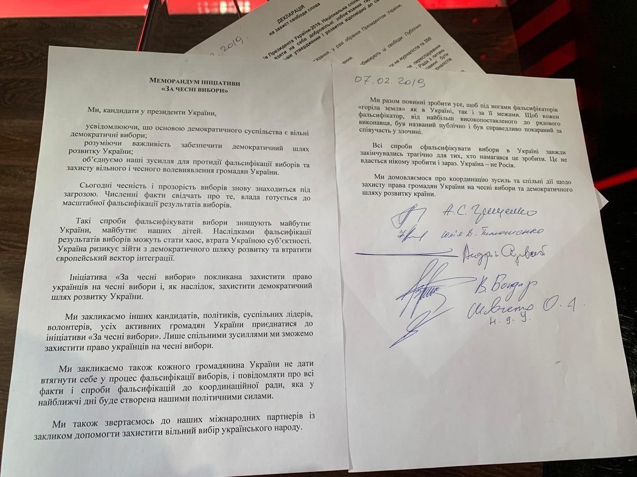 Кандидати у президенти Юлія Тимошенко, Володимир Зеленський, Анатолій Гриценко, Андрій Садовий, Олександр Шевченко та Віктор Бондар у четвер, 8 лютого, підписали меморандум «За чесні вибори». П’ятеро з кандидатів підписали його під час суспільно-політичного ток-шоу «Право на владу», пише ТСН.