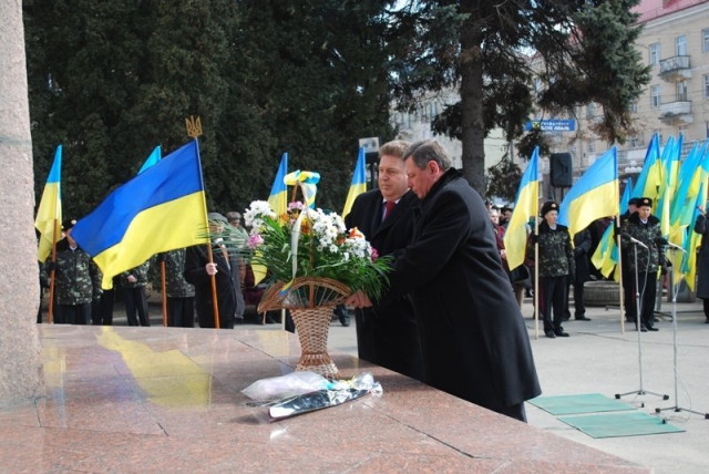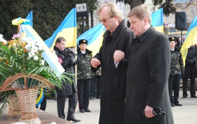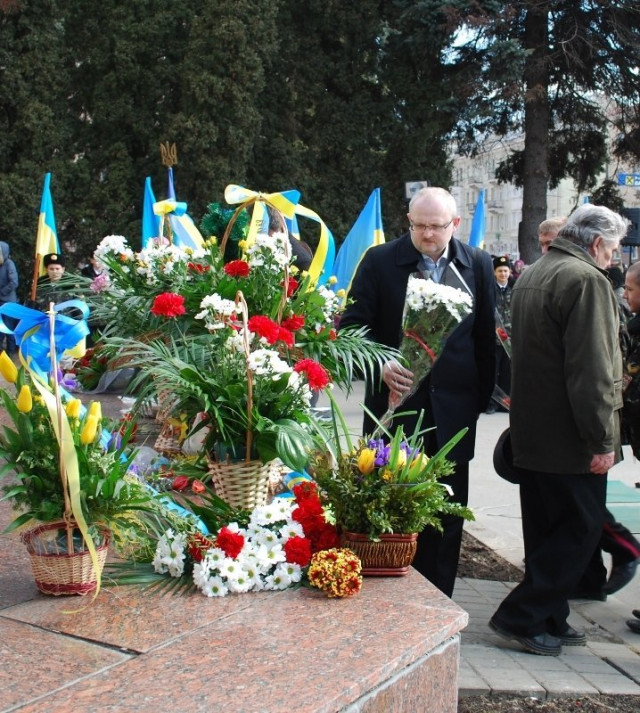 Не обійшлося й без лідерів політичних партій області. Голова Волинської обласної організації партії «Фронт змін» Олександр Пиза поклав до підніжжя букетик білих хризантем.