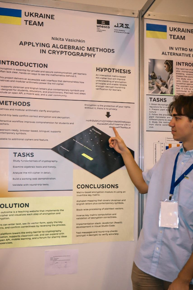 Учень Луцького ліцею № 9 Нікіта Васічкін представив проєкт «Застосування алгебраїчних методів в криптографії», що поєднує глибокі математичні підходи та сучасні виклики кібербезпеки. Хлопець здобув третє місце KIDE 2025, підтвердивши високий рівень підготовки українських школярів у сфері наукових досліджень.«Нікіта Васічкін – переможець обласного та всеукраїнських етапів конкурсу-захисту науково-дослідницьких робіт Малої академії наук України, тож його успіх на міжнародній арені є логічним продовженням його наполегливості та таланту», – зазначила директорка Волинської МАН.