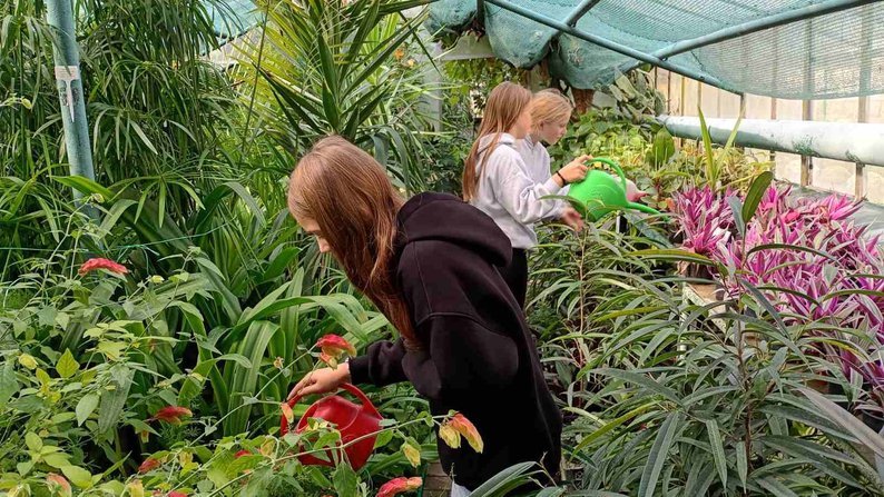У теплиці натуралісти-переможці спостерігають за екзотичними рослинами, зокрема за цвітінням і плодоношенням банана, пише Суспільне.
