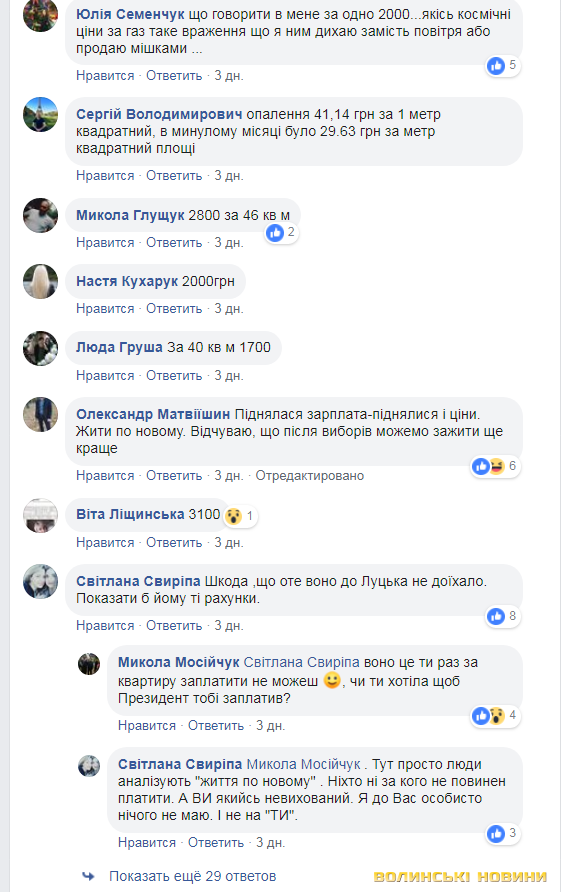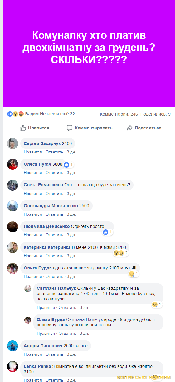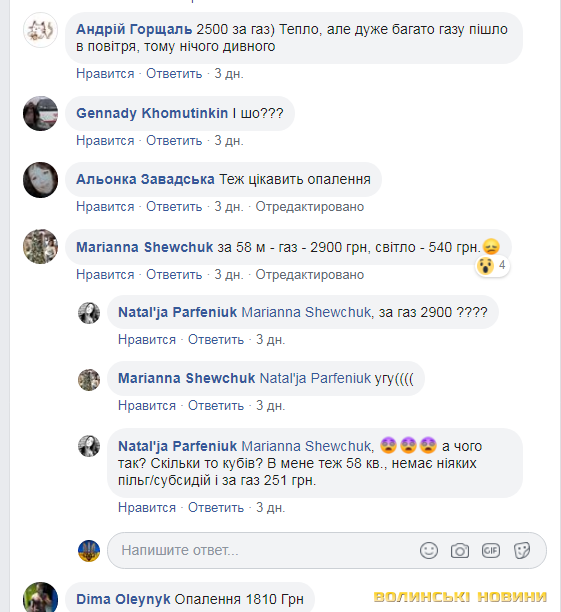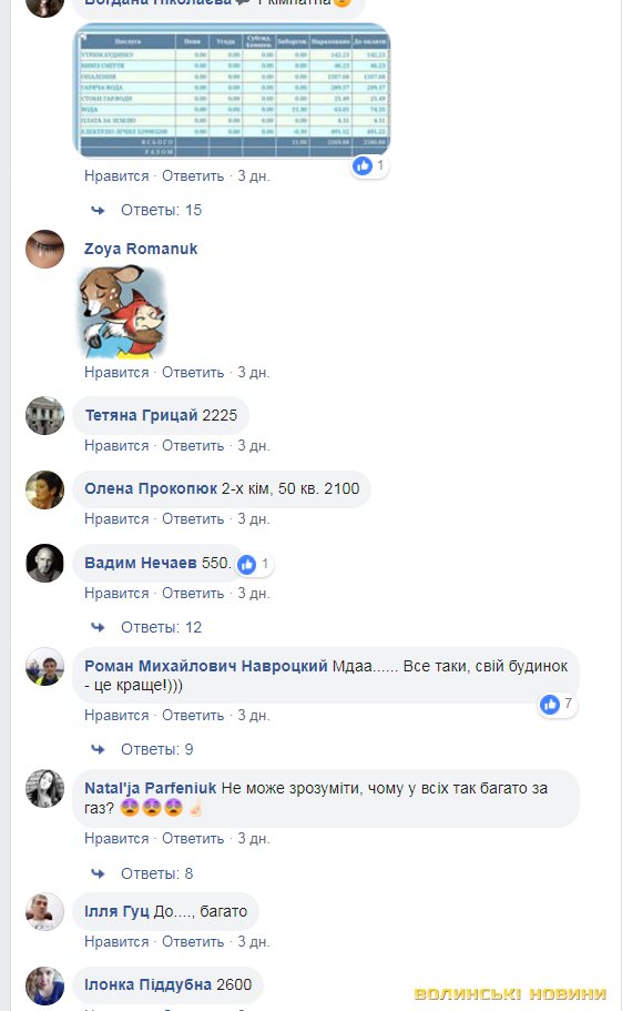 Щойно з’явилися нарахування – це стало топ-темою обговорень в громадському транспорті, на вулицях, у соцмережах. Суми в усіх різні, залежать від квадратури житла, чи є централізоване опалення чи індивідуальне, чи є колонка для підігріву води чи централізоване гаряче водопостачання, чи встановлені лічильники на газ, воду й інші нюанси. Проте цифри вражають: 3200 гривень за двокімнатну квартиру в «хрущівці» з лічильниками газу та води,а у декого лише опалення обійшлося в 2000 за «двійку».Тим, хто мешкає в однокімнатних теж не солодко. Лучанка Ольга Савчук, наприклад за 1-кімнатну квартиру заплатила 1270 гривень, 860 гривень з яких – за тепло. Хоча й тепла, каже, не відчувають, бо в квартирі – постійно холодно, мусять вмикати духовку, аби сяк-так зігріти помешкання. Але в жінки порівняно ще невелика сума до оплати. В місті є такі однокімнатні квартири, мешканцям яких нарахували лише за опалення 1500 гривень.