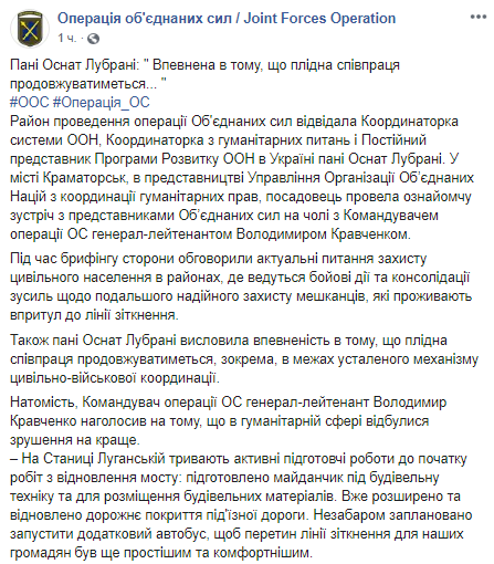 Про це повідомляє пресцентр Штабу ООС в Facebook.