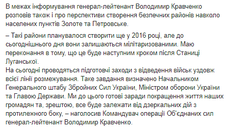 Так, за словами командувача операції Об’єднаних сил Володимира Кравченка, завдання вести підготовку до розведення військ поставили начальник Генерального штабу ЗСУ, міністр оборони і президент України.