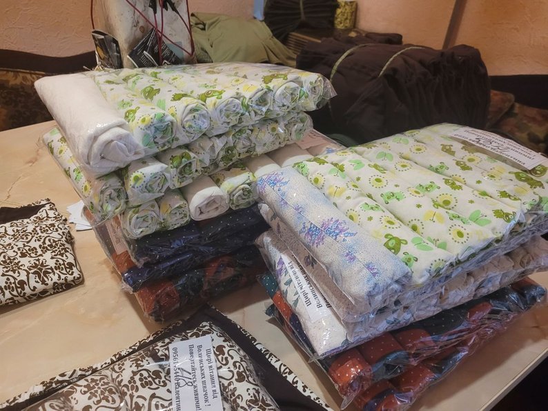 «За цей час ми нашили 35 тисяч трусів, потім почали шити штани, футболки, фліски – усе, що потрібно фронту. Я ще називаю нашу групу «Швидка допомога». Бо ми робимо те, що необхідно саме зараз. Тепер шиємо речі для шпиталів і стабілізаційних пунктів», – розповіла Валентина Слободчук.Матеріали для пошиття, каже волонтерка, купують за кошти благодійників. Робота триває щодня, без вихідних.