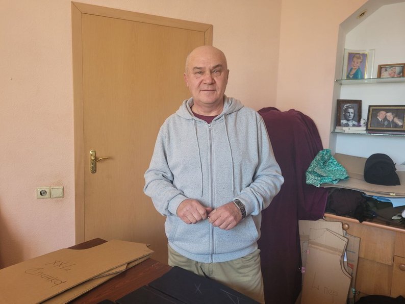 До команди також долучився пенсіонер Сергій Мурзаєв, інженер зварювального виробництва за освітою. Викрійки він навчився робити вже тут.«Воно трохи важке, коли рулони півтора метра і це все розложити, зловити правильно лицем до середини і розправити. Ножицями мінімум 10 слоїв треба взяти, щоб вони нормально різали», – каже чоловік.
