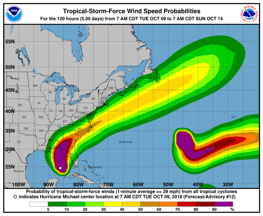 Як повідомлялося раніше, прогнозується, що «Майкл» досягне американського узбережжя в першій половині середи. Основний удар приймуть на себе штати Флорида, Алабама й Джорджія. Синоптики прогнозують, що стихія просуватиметься далі на північний схід США.