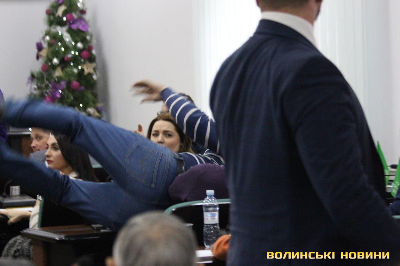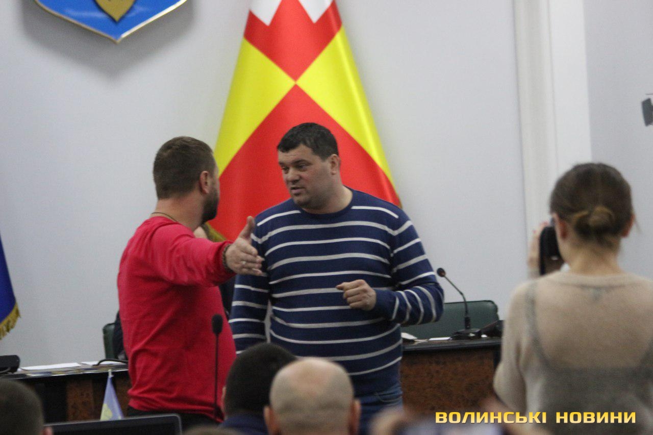 Під час засідання сесії Луцької міської ради активіст «Самооборони» Сергій Рижков попросив слова, втім депутати не надали йому цього права. Коли Рижков покидав зал, у нього виник конфлікт з депутатом Євгенієм Ткачуком, в результаті чого Рижков вистрибнув на стіл, імітуючи падіння від «сильного» удару.