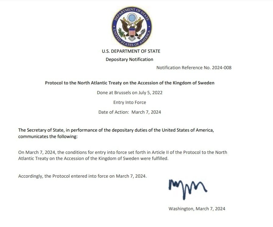 Швеція офіційно приєдналася до НАТО. Вона стала 32-м членом Альянсу.