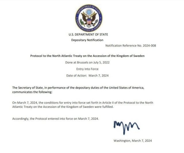 Швеція має передати ратифікаційні документи, що офіційно завершить процедуру вступу, близько 18:15 за київським часом.Швеція і Фінляндія у травні 2022 року відмовилися від традиційного нейтралітету на тлі військового вторгнення Росії в Україну і подали заявки на вступ до НАТО. Фінляндія приєдналася до блоку в квітні 2023 року.