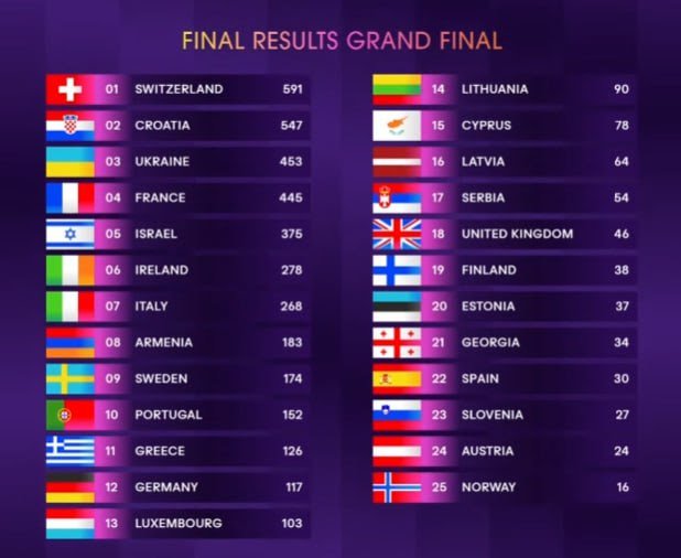 Для Швейцарії це третя перемога на «Євробаченні».alyona alyona & Jerry Heil виступили з піснею Teresa & Maria під номером 2. Наші співачки виступили з постановкою від дворазової номінантки «Ґреммі» Тані Муіньо.Після виступу вони звернулися зі сцени: «Unity for the world! Peace and Freedom for Ukraine!»Представниці України alyona alyona & Jerry Heil посіли третє місце, набравши 453 бали: 146 від журі та 307 від глядачів.