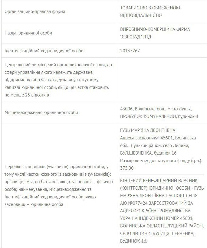 Більше активів Віталій Гузь у своїй декларації не вказав. Мар'яна Гузь є донькою відомого луцького бізнесмена-забудовника Леонтія Іванішина. На фото крайній праворуч - Леонтій Іванішин на сімейному святі з дружиною, донькою Мар’яною, зятем та онукамиЗгідно з реєстром Мін'юсту, вона є бенефіціаром компанії ТОВ ВКФ "Євробуд", де директором працює її батько. Про те, що це одна і та ж особа свідчить, зокрема, і те, що у декларації Віталія Гузя за 2016 рік вказано, що його дружина працювала у ПП «Захід», де отримувала заробітну плату. Власником ПП «Захід», згідно з реєстром, є Іванішина Мирослава Ярославівна, зареєстрована в селі Липини (де і зареєстрована власниця ТОВ «Євробуд» Мар’яна Гузь). Але в декларації Віталія Гузя компанія дружини ТОВ ВКФ "Єробуд" не вказана.