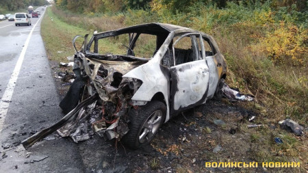 Зі слів чоловіка, він їхав зі сторони Торчина в напрямку Луцька, коли помітив палаючий автомобіль та ще один розбитий, який стояв поруч.
