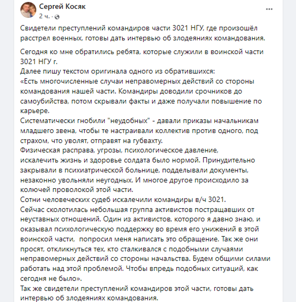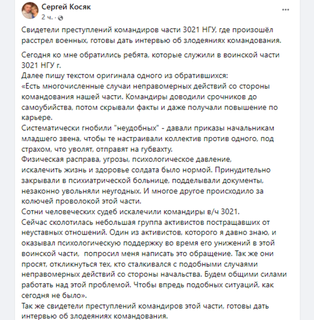 «Свідки злочинів командирів частини 3021 НГУ, де стався розстріл військових, готові дати інтерв’ю про злодіяння командування, – написав він. – Сьогодні до мене звернулися хлопці, які служили у військовій частині...»