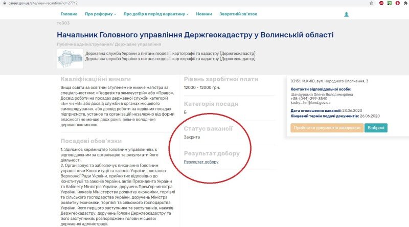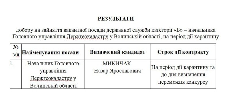 Водночас, як стало відомо, саме 2 липня у Києві за адресою вулиця Народного Ополчення, 3 (головний офіс Держгеокадастру), проходила співбесіда для добору на посаду начальника Головного упраління на Волині. У конкурсі взяло участь семеро кандидатів. Як випливає з інформації Порталу вакансій, добір на зайняття вакантної посади державної служби категорії «Б» – начальника Головного управління Держгеокадастру у Волинській області, на період дії карантину пройшов Микичак Назар Ярославович. Хоча водночас він мусив знаходитися на лікуванні в обласній лікарні Волині.З метою дотримання законодавства про захист персональних даних на зображенні редакцією приховано частину інформації