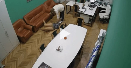 Найцікавіше починається, коли сідає сонце. Наступні кадри камера відеоспостереження зафільмувала, напевно, ввечері іншого дня. Люди знов сидять за накритим столом, але тут майже немає їжі. На столі лимончик, цукерки, «Мартіні» та горілка.«Починається жерсть. Ми бачимо коридор. Найімовірніше, це коридор якоїсь урядової чи чиновницької установи. Бачимо людину, яка лежить на підлозі. Поряд із нею влягається інша людина. Потім цю ж людину намагається втримати у вертикальному положенні колега. Далі починається ще цікавіше — підложні вправи», — розповів журналіст ТСН Дмитро Фурдак.