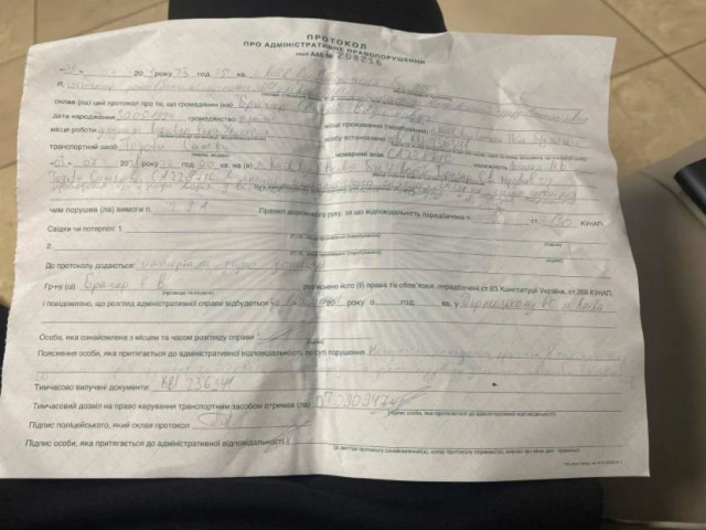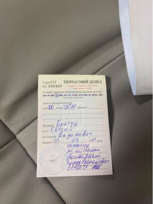 Також у відео патрульні стверджують, що «слуга народу» та його помічник їм погрожували, а також обзивали «ідіотами».У розпорядження видання потрапив протокол поліції, в якому затвердили стан наркотичного сп'яніння.На Брагара склали адміпротокол.Тимчасове посвідчення водія.