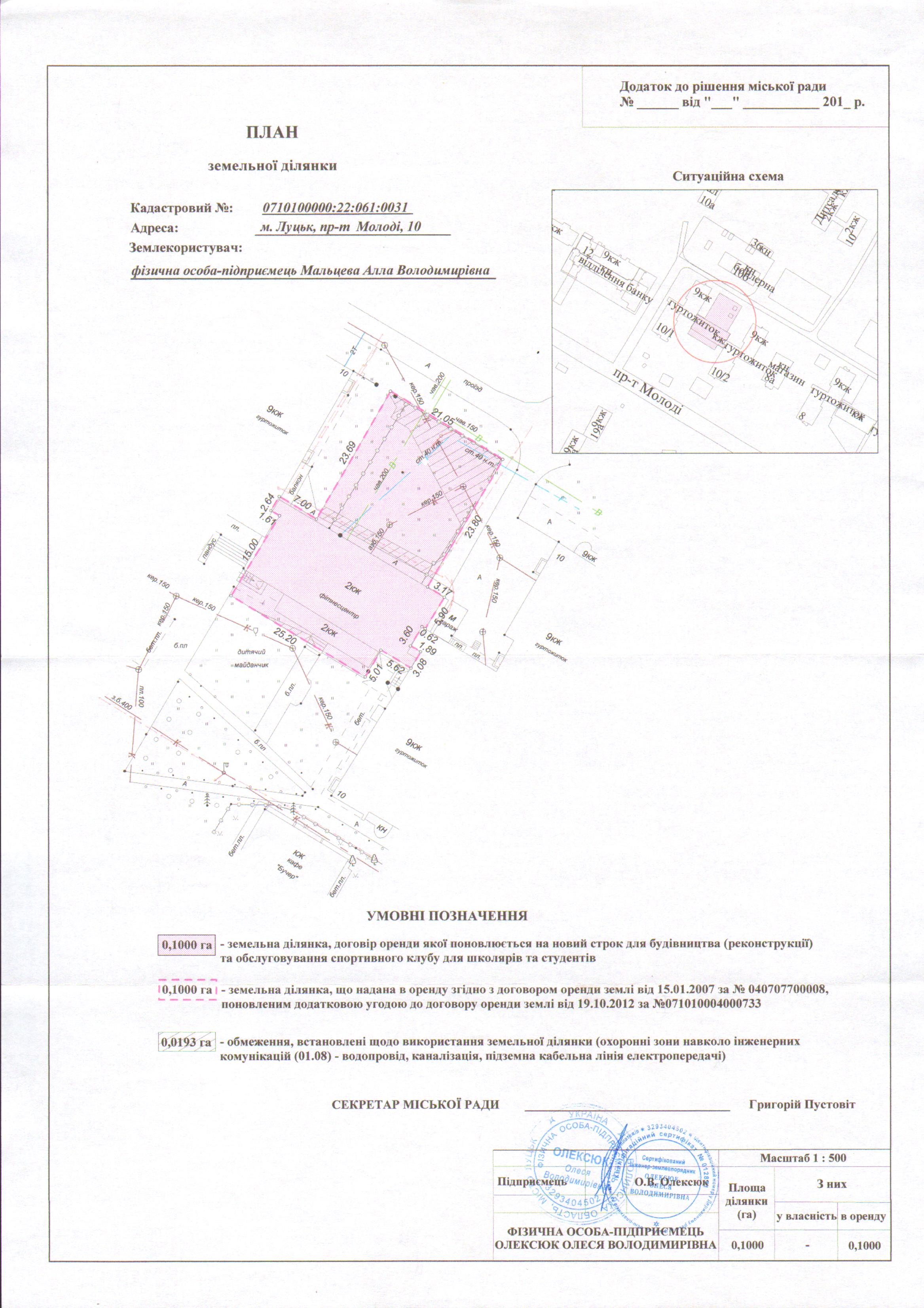 Так, на розгляд сесії був винесений проект рішення щодо поновлення договору оренди земельної ділянки на проспекті Молоді, 10 фізичній особі-підприємцю Аллі Мальцевій строком на 10 років з дати закінчення договору оренди землі для будівництва (реконструкції) та обслуговування спортивного клубу для школярів та студентів. Площа ділянки становить 0,1000 га.