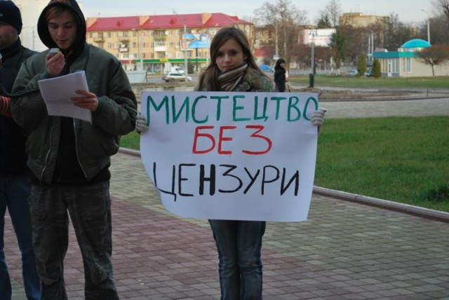 Сьогодні ж, 30 листопада, під стіни Волинської ОДА прийшло п’ятеро луцьких студентів-юристів та студентів-політологів. Вони мали мегафон і плакати з гаслами «Мистецтво без цензури», «Свободу в’язню совісті Володарському» тощо. Протестувальники назвалися луцькою ініціативною групою «Захистимо мистецтво».
