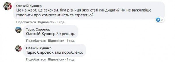 А хіба професор Рудь не балотується? Він також чоловік. І Редько також наче виставляв свою програму. Але все таки технічним внз не мають керувати педагоги чи економісти, бо йому тоді точно кінець.