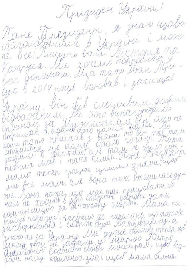 «Пане Президент, я знаю, що ви найголовніший Україні і можете все! Пишуть вам Вікторія і Катруся. Ми хочемо попросити у вас допомоги. Мій тато Іван Тричук 2014 році воював і захищав Україну. Він був сміливим, добрим, відважним. Ви його нагородили орденом за Мужність, але він його не отримав, а віддали його нашій мамі. Бо коли тато приїхав з війни, то він так там стомився, що йому стало погано. Тата забрали в госпіталь, але там не було потрібних ліків і тато помер.