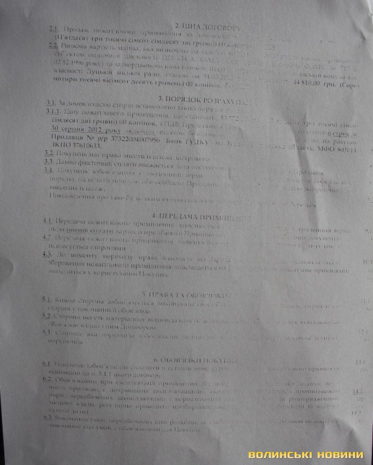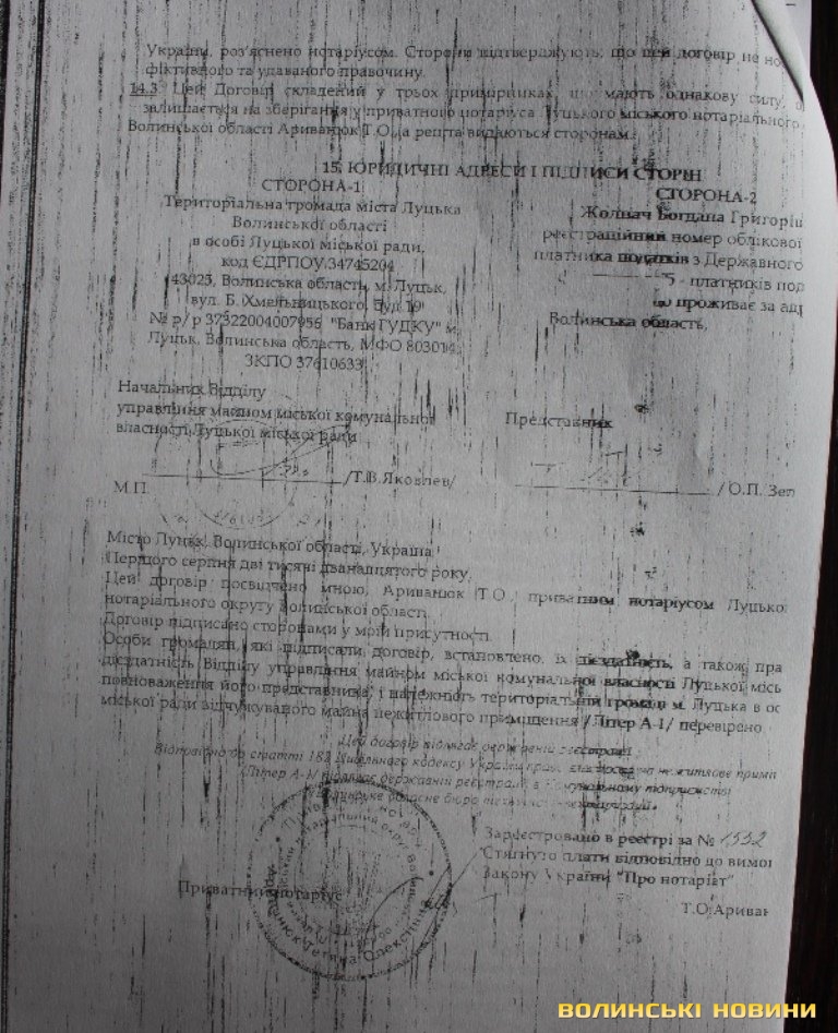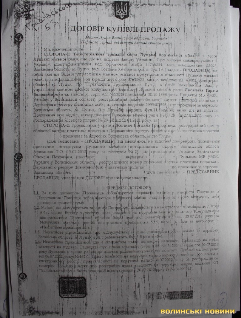 Отож, пригадаємо. За схемою "орендував-відремонтував–купив" у Луцьку продали приміщення за адресою Грабовського, 5б. Так, 15 листопада 2010 року між відділом майна міської комунальної власності департаменту економіки Луцькради укладено договір про оренду із пані поважного віку Богданою Жолнач. Предмет договору - площа 99.45 метра квадратних. Далі з’явилося рішення виконавчого комітету від 07.04.2011 року про дозвіл на проведення невід’ємних поліпшень.