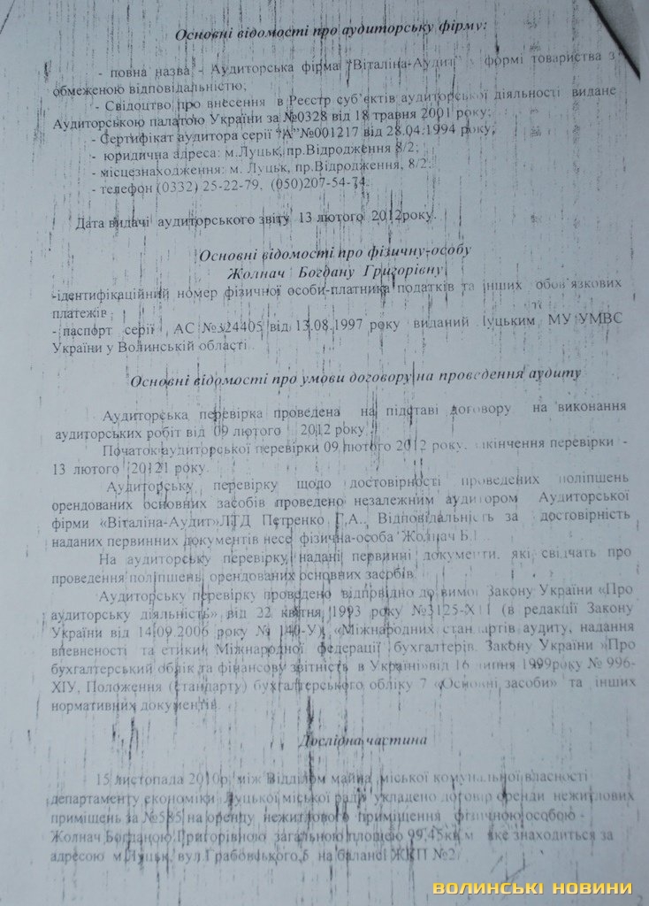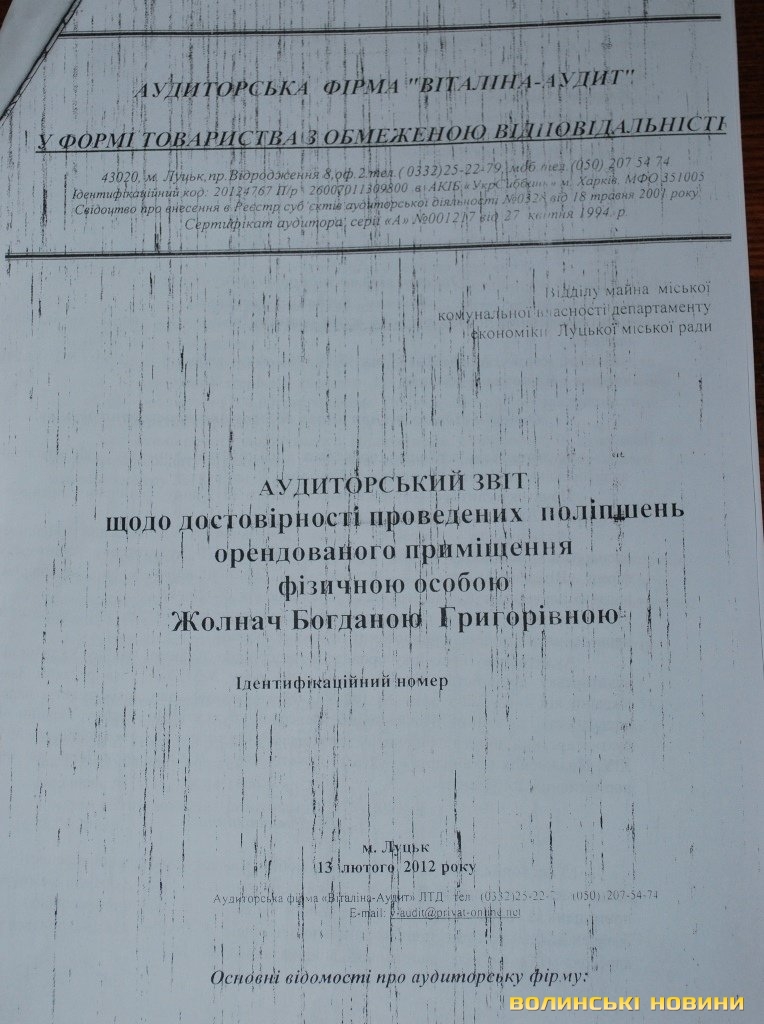 Відповідно до аудиторського звіту щодо достовірності проведення поліпшень орендованого приміщення Богданою Жолнач, від 13 лютого 2012 року орендодавець купила будматеріалу на суму 8301.48 гривні та заплатила 5200 гривень за ремонтні роботи. Втім у звіті зауважено, що висновки робили, не виїжджаючи на місце, а з документів, які представила сама ж Жолнач.Після цього міська рада ухвалила включити об’єкт до переліку приватизації шляхом викупу орендарем Жолнач.