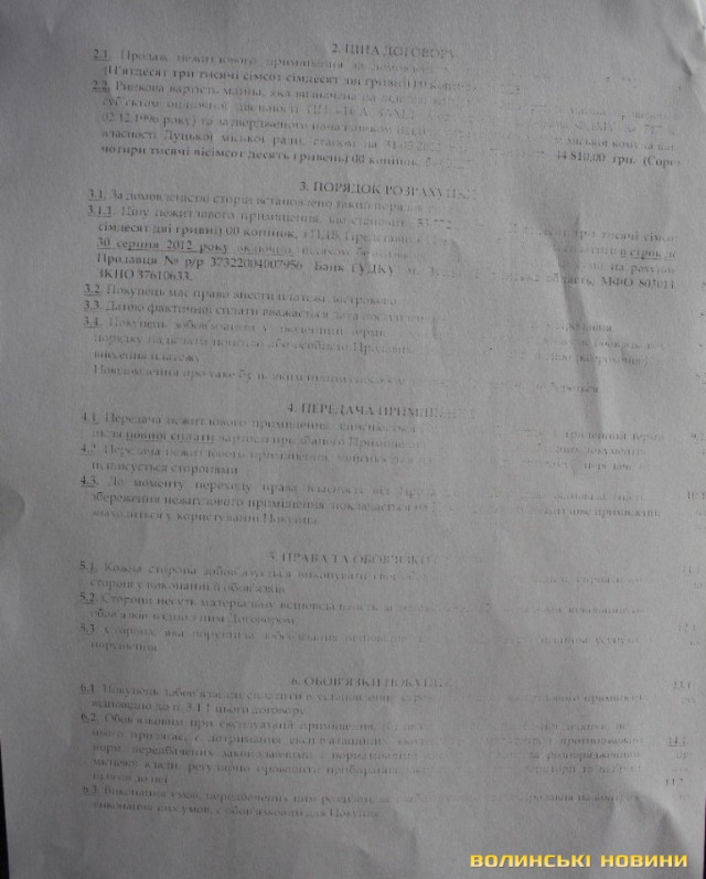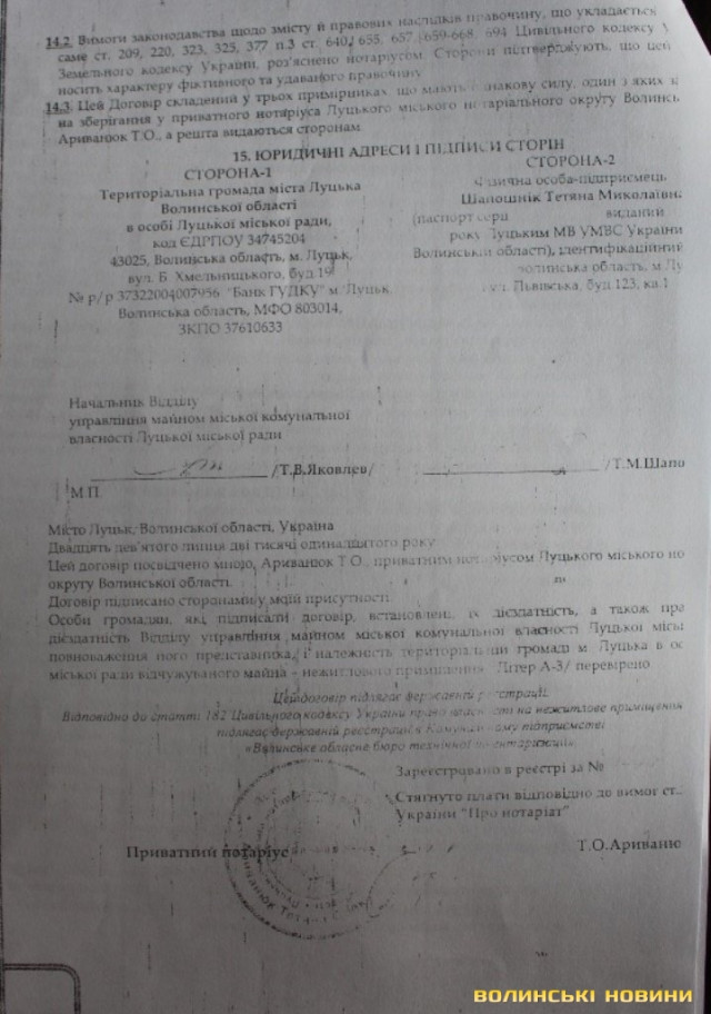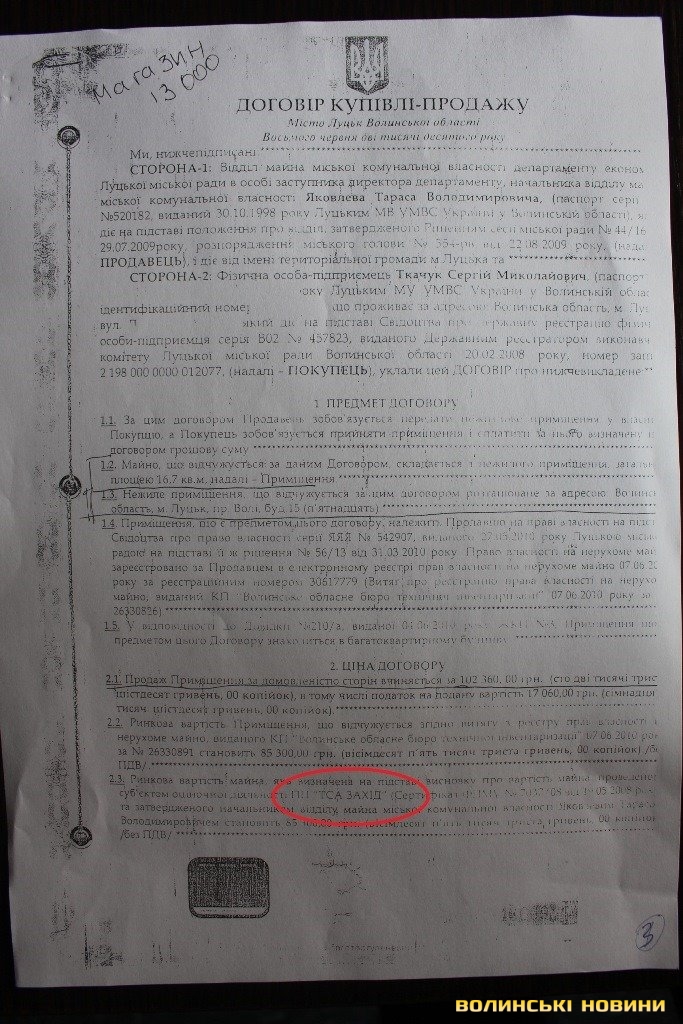 Договір купівлі-продажу був укладений за підписом тодішнього начальника Відділу управління майном міської комунальної власності Луцької міської ради Тараса Яковлева.У ньому вказано, що таке собі ПП «ТСА Захід» оцінили приміщення в 44 810 гривень.Однак домовилися продати трохи дорожче - за 53 772 гривні. Далі вже власник приміщення звертається за дозволом щодо відведення земельної ділянки для обслуговування цього ж приміщення й просить передати у власність площу, що становить 0.1175 га.СПРАВЖНЯ ЦІННІСТЬ РУЇНИ ІЗ ЦЕГЛИ – ЗЕМЛЯ