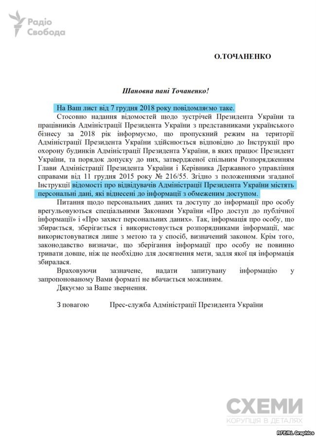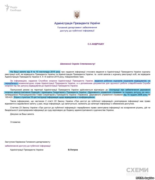 У 2015 році йому відповіли: «Підрахунок таких даних Адміністрацією Президента не здійснюється» і «ведення робочих журналів не передбачено», – а ще послались на внутрішню Інструкцію, затверджену ще Віктором Балогою за часів Віктора Ющенка, про те, що інформація про відвідувачів АП є конфіденційною.