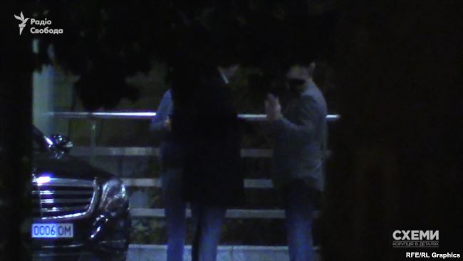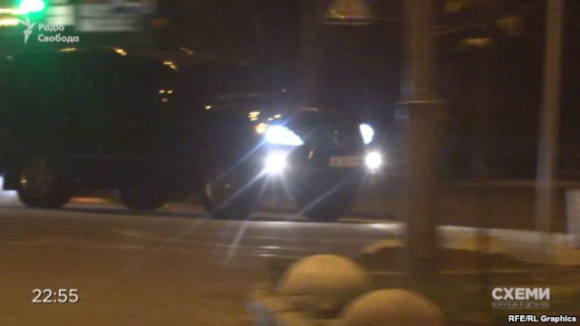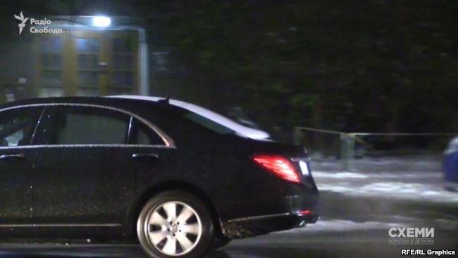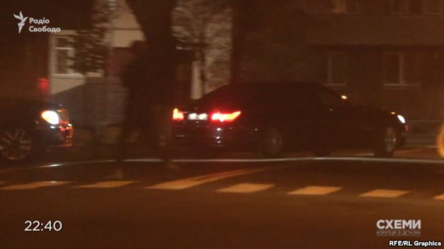 Позашляховик, який завозив гостя до Адміністрації президента, виїжджає з території АП через дві з половиною години – через бічні ворота – і під’їжджає до мерседеса. З позашляховика виходить чоловік з паперами в руках і пересідає до мерседеса. І позашляховик, і кортеж одразу рушають.