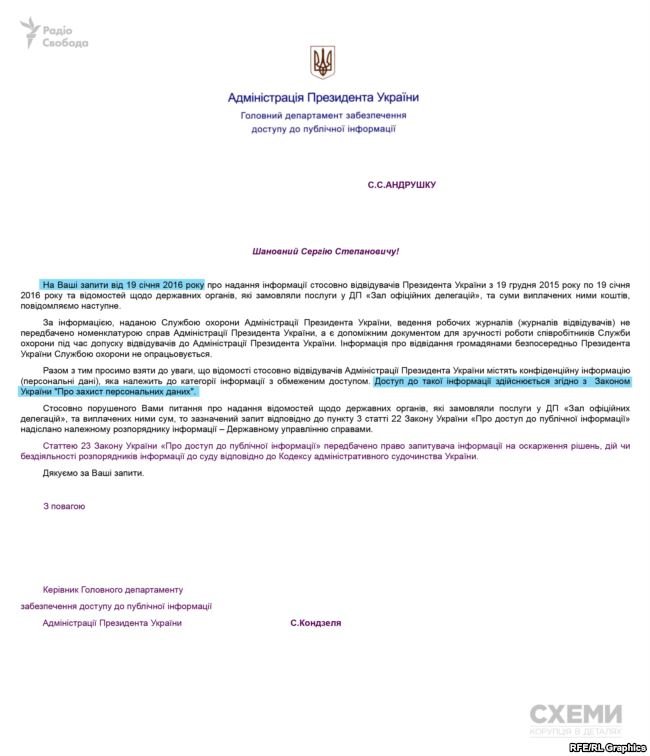 У 2016 році на такий запит теж відмовили і додали ще одну підставу: інформація про тих, хто приходив до Порошенка, захищена законом «Про персональні дані».
