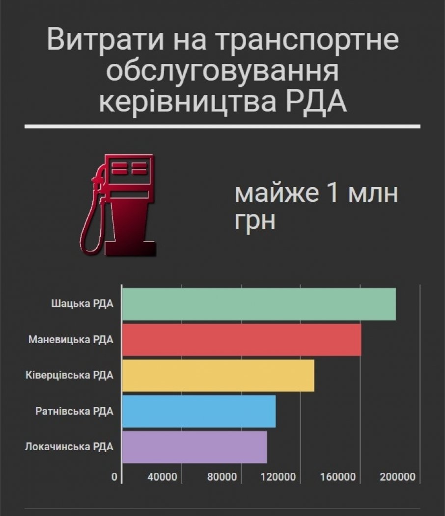 Протягом 2018 року голова Шацької РДА та його заступники проїздили майже 183,5 тисячі гривень. Для порівняння, транспортне обслуговування керівництва облдержадміністрації, Володимир-Волинської, Іваничівської та Рожищенської РДА вкупі коштувало фактично стільки ж – 185 тисяч бюджетних гривень.