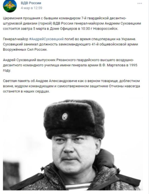 11 березня Сухопутні війська ЗСУ повідомили про ліквідацію генерал-майора Андрія Колесникова, командувача 29-ї армії Східного військового округу Росії.