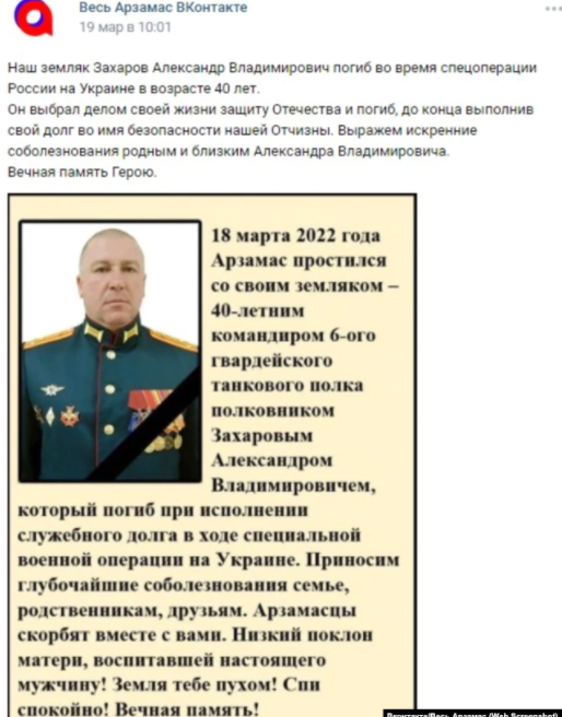 10 березня розвідка України повідомила про ліквідацію під час ведення бойових дій в Броварському районі Київської області командира 6 танкового полку (Чебаркуль) 90 танкової дивізії Центрального військового округу, полковника Захарова. У спільноті «Весь Арзамас ВКонтакте» повідомили, що попрощаються з Олександром Захаровим 18 березня.Читати ще: П’ятий за три тижні: ЗСУ ліквідували ще одного генерала РФ