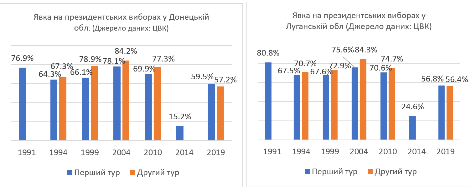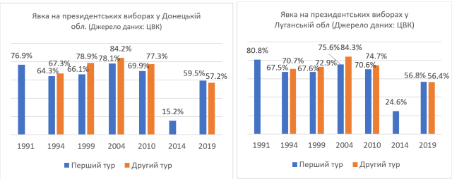 Показник явки на президентських виборах 2019 року зріс порівняно з 2014 майже на 3%, якщо порівнювати перші тури – не в останню чергу через збільшення активності виборців у Донецькій та Луганській областях у 2019 році.