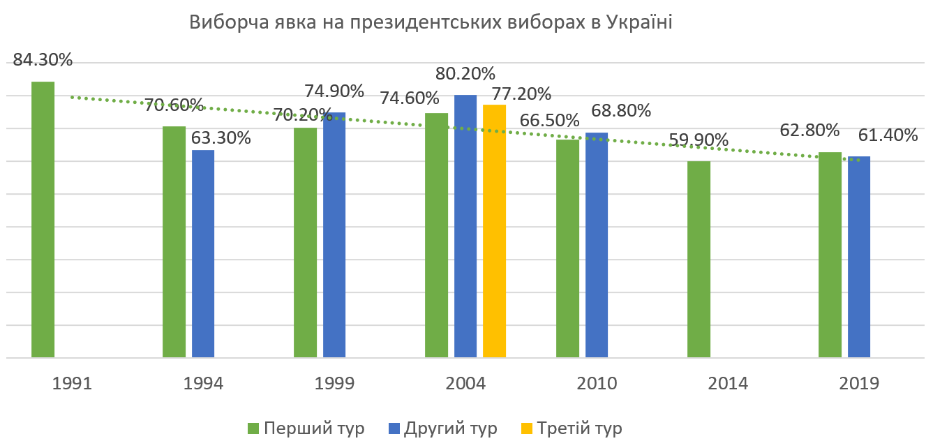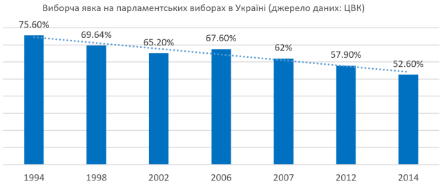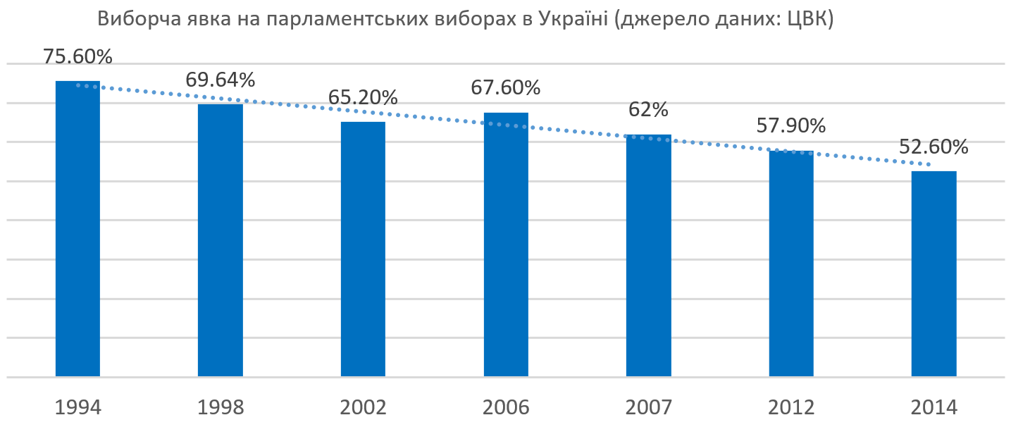 Динаміка участі у виборах показує стійку тенденцію до зменшення активності виборців від часів проведення перших виборів у незалежній Україні. Це явище є типовим для постсоціалістичних європейських країн, які здобули незалежність на початку 1990-х років, що спричинило ефект "перших виборів" – високі показники явки виборців у перших демократичних виборах.
