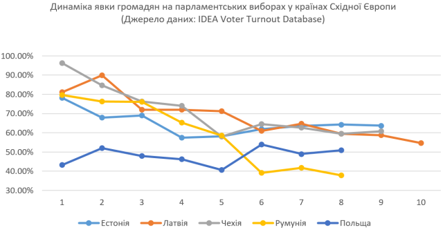 З урахуванням впливу національних політичних контекстів ця тенденція виявлялася різною мірою у країнах Східної Європи. Оскільки у кожній з країн відбулася різна кількість виборів та у різні роки, для порівняння використовуються позначки 1, 2 ... 10 на осі х, які означають хронологічну черговість кожних виборів від моменту перших демократичних виборів
