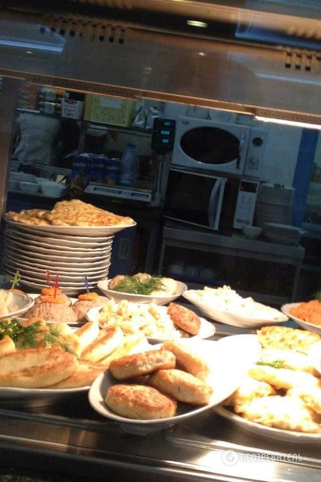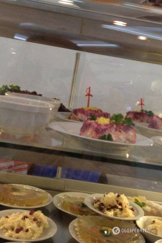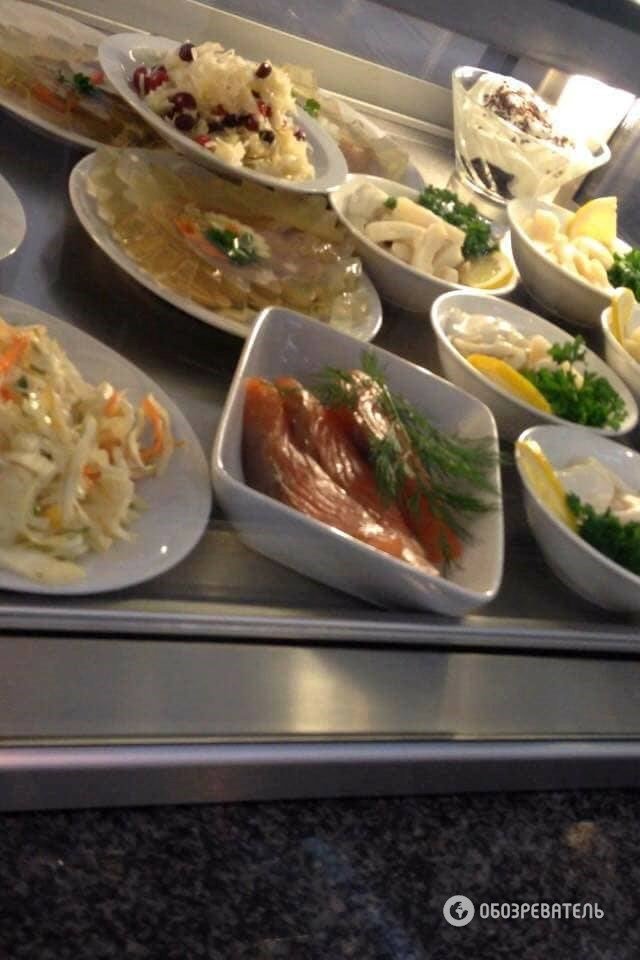 Так, у меню, яке на подив залишається незмінним як мінімум з початку вересня, пропонується з десяток салатів вартістю від 15 до 198 грн, бутерброди з червоною ікрою і сьомгою, тигрові креветки та інші закуски.