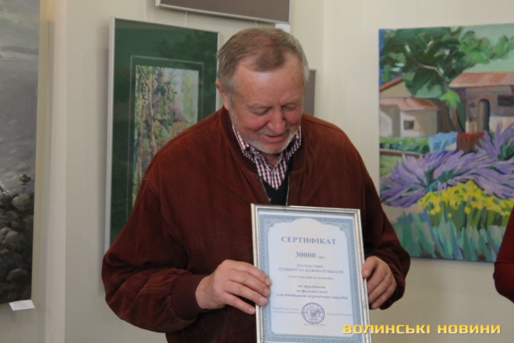 Луцькій художній школі передали сертифікат на придбання вугільної печі для випалювання керамічних виробів. Подарунок вручили 12 жовтня під час відкриття виставки творчих робіт викладачів Луцької художньої школи з нагоди дня художника «Осіння палітра» в арт-галереї «Луцьк».