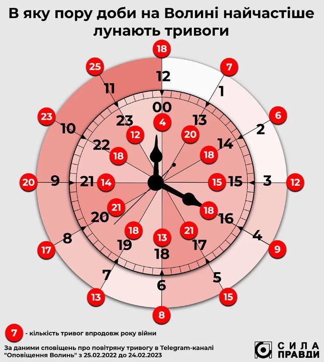 Чверть тривожних повідомлень (91 із 365) пролунали в нічний час – між 22-ю годиною вечора та 7-ю ранку. З них 30 – до півночі, а 61 – після півночі.Найдовша перерва між тривогами відбулася між 6 та 14 січня цього року. Тоді сирену не вмикали впродовж восьми діб. Найкоротший період між тривогами становив 2 хвилини та 15 секунд, а в середньому період між тривогами сягає майже 23 години, тоді як у перший місяць вторгнення становив до 7 годин.Якщо подивитися на частоту тривог впродовж доби, то найчастіше агресор створює загрозу для заходу України вранці та увечері: між 8 і 11 годинами ранку та після 19-ї. Найрідше – між 24 та 3 годинами ночі.