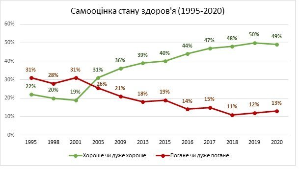 Так, у квітні 2020 року 49% опитаних українців оцінили своє здоров’я як хороше або дуже хороше, 38% – як посереднє (ані хороше, ані погане) або не змогли визначити, а 13% – як погане або дуже погане.